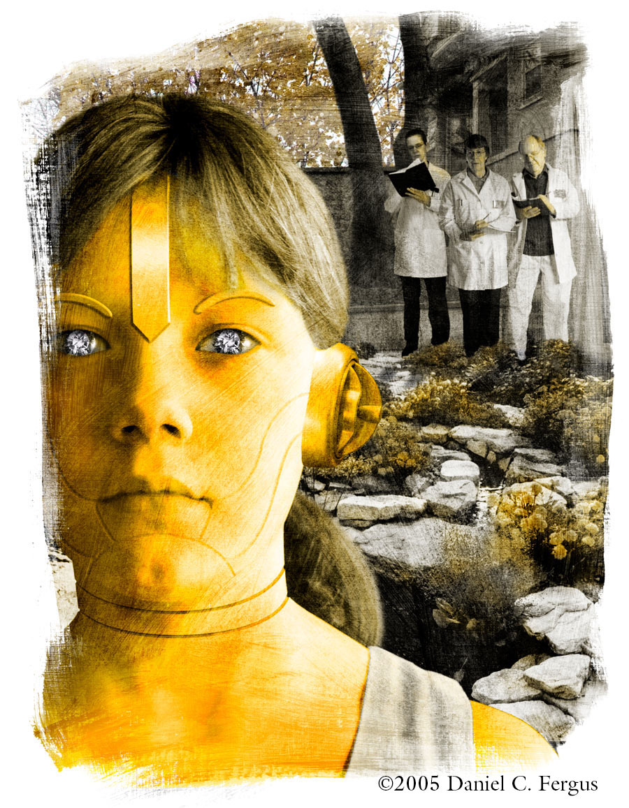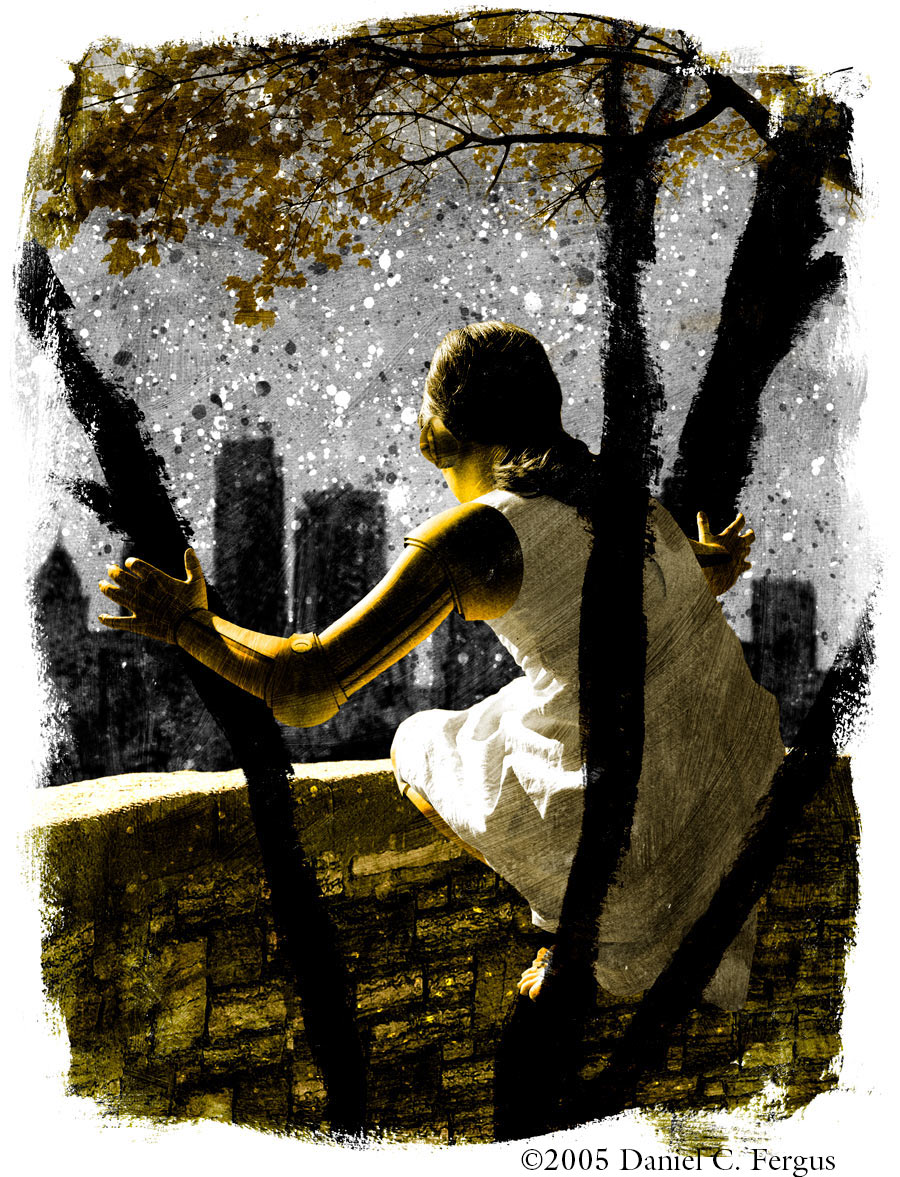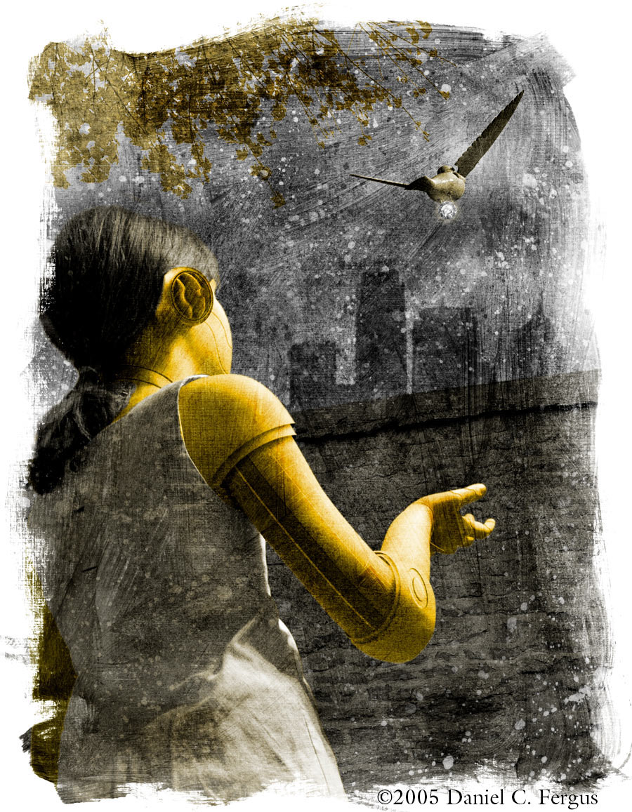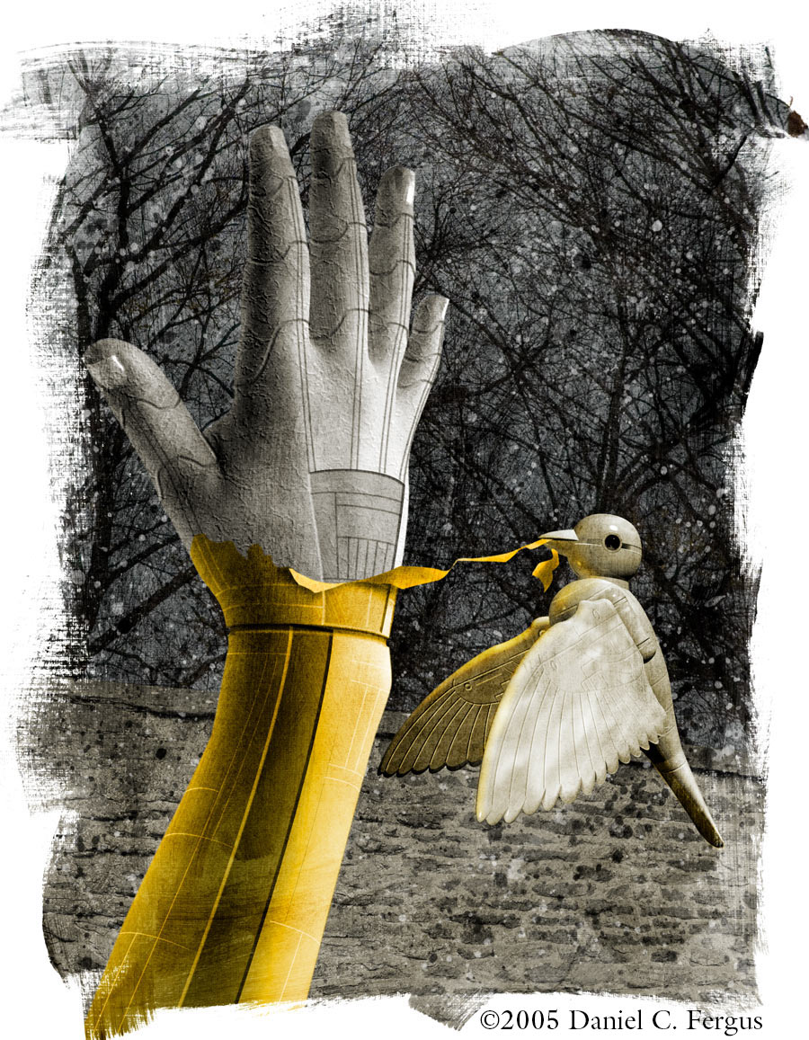 Oscar Wilde's The Happy Prince has always been one of my favorite stories. In 2005 I wrote The Happy Robot—which puts a 21st century spin on the tale—and created a series of digital illustrations for it. The robot (yes, she's crying; she's no longer happy at this point in the story), started as a photo of my daughter Rachel, which I took into Photoshop and manipulated (anyone recognize where her ear came from?). The robot bird was a 3-D model that I created with Infini-D. Other elements include photos of trees, paint spatters and strokes, tree bark, and other fun stuff. Click on the thumbnails below to see more of the illustrations. If you have a Flash plug-in for your browser, you can read the story complete with illustrations (you may have to disable your pop-up blocker to see it). I also created a short animated film narrating the introduction to the story.